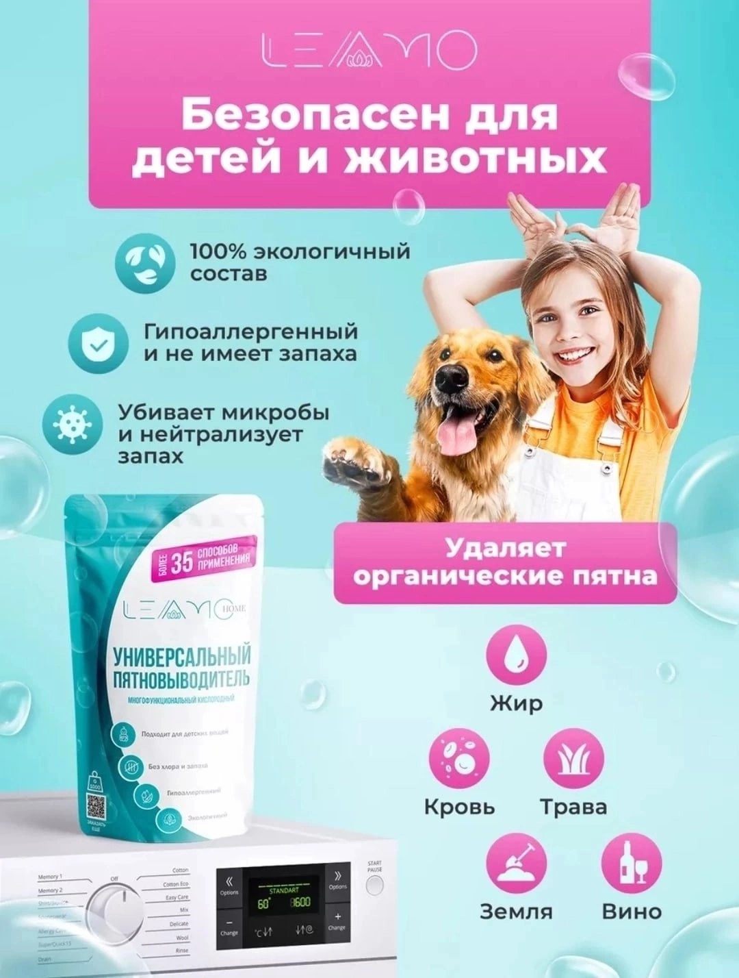 Экологичный гипоаллергенный пятновыводитель без хлора в составе не имеет запаха. Это не только незаменимый помощник в уборке, но и безопасное средство, состав которого позволяет мамам стирать детские вещи. Эффективный пятновыводитель с мерной ложечкой внутри, заменяет большинство средств бытовой химии.