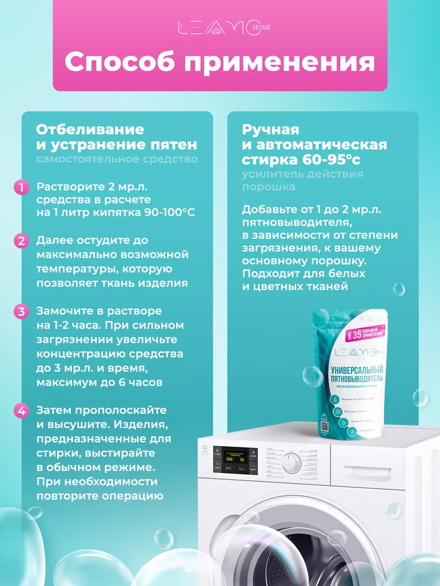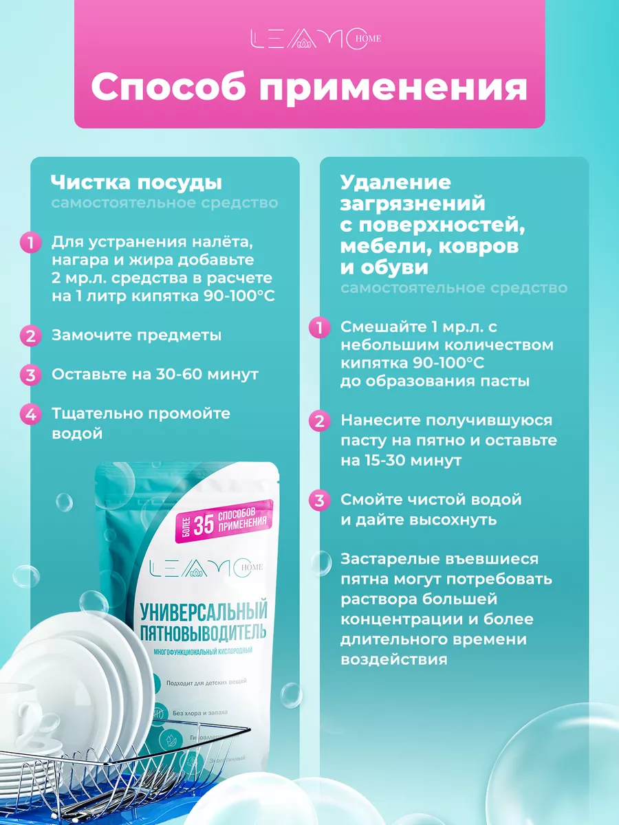 Он работает как добавка - усилитель порошка при ручной и автоматической стирке 60-95°с цветных и белых вещей. Также антибактериальный уничтожитель пятен эффективен при отбеливании и чистке подошвы кроссовок, мытье обуви, чистке ковров, уборке комнаты, устранении запахов, дезинфекции игрушек малышей и других предметов и покрытий. Для этого необходимо растворить моющую продукцию в горячей воде и замочить изделие на 1-6 часов, в зависимости от степени загрязнения. Трудновыводимые загрязнения удаляются при непосредственном нанесении экологического отбеливателя на пятно.